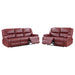 Deep red faux leather captures attention immediately in this reclining living room seating set. Plush foam cushions and pillowtop arms ensure exceptional comfort, while covered leg rests create the perfect relaxed ambiance. Vertical stitching accents add a hint of texture and dimension while contour tufting creates targeted support for movie nights and Sunday game days. Seats feature webbing support with sinuous springs that create wonderful comfort and relaxation. The stylish, rich color of the set adds refined character in your living room, offering versatility for everything from entertaining to relaxing with the kids.