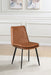 Simplified structure lends timeless personality to a set of two dining side chairs. Perfect for a relaxing and inviting breakfast nook or dining table, the chair feature warm coffee faux leather upholstery, with a padded seat for extra comfort. The armless seat is gently rounded to create exceptional support and comfort for everything from your morning coffee to a lingering meal shared with family and friends. The base of each chair features tapered, flared legs, crafted in metal with a black finish for a crisp look and feel at any table. The earthy look of faux leather is a charming complement to both wood and stone dining tables, making this a versatile choice that blends seamlessly with existing decor.