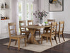 LEONIDAS Dining Table, 76"L X 39"W X 3"H, 128.76lbs. This is a striking dining table for those looking for unique tone finishes. This antique black, upon closer inspection, reveals beautiful grain visible on the plank style table top. The trestle base has intricately carved designs that match the subtle curves of the chairs, along with their contoured back rest that wraps around the user. Made of pine and rubber wood, this solid ensemble redefines the dining hall color palette.