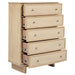 This five-drawer chest is the perfect blend of practicality and style, offering ample storage for your bedroom while enhancing its overall aesthetic. The beige oak finish exudes natural warmth, while the smooth metal extension glides ensure easy access to your belongings. With antique brass hardware adding a subtle vintage touch, this chest brings an air of timeless elegance to any space. Built with quality materials, it is both durable and stylish, making it a lasting addition to your home.
