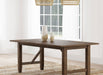 Set the tone in your stylish home with the welcoming ambiance of a modern farmhouse dining table. The rectangular table features a clean, streamlined silhouette complete with a recessed apron and decorative diagonal braces that bring architectural appeal. The table offers a natural wood finish to highlights its beautiful mahogany and rubberwood construction and veneers. The tabletop expands with the addition of the leaf, which measures 18-inches across to add seating for two more of your favorite people. Tapering feet are a subtle finishing touch, defined with linear trim that adds the perfect dose of dimensionality. Key Features: • A rectangular dining table creates inviting ambiance with stylish wood grain and understated design • Straight, square legs feature carved linear accents above tapering feet for a crisp, clean look • Warm natural wood finish highlights simplicity of design and subtle elegance • Table adds classic Americana character with diagonal brace details and stretcher bars between legs • Table features a removable leaf perfect for hosting friends and family or daily use in a large space