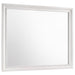 Encourage a glam vibe in your refined bedroom with a modern four-piece bedroom set. Centering on a stylish bed with an upholstered headboard and low footboard, the set includes a two-drawer nightstand for easy bedside storage and display space. A seven drawer dresser and mirror complete the set, adding diamond-like trim across its face that catches the light and offers a sophisticated touch. Bracket feet add a touch of dimensionality and movement to each piece and jewel-like bar pulls add intriguing sparkle. A cool white finish is textured, while white finish trim is smooth, creating a touch of textural contrast that add engaging style. Key Features: • Bedroom set with upholstered panel bed featuring glitter-accented headboard stripe • Textured white panel surfaces contrasted by smooth white molded trim throughout • Low profile footboard and bracket legs offer a modern and airy foundation • Storage cases include secret jewelry drawers behind glittery front panels • Drawers are felt-lined and glide on full-extension hardware for smooth operation • Crystal-style handles and sparkling trim provide glam-inspired sophistication